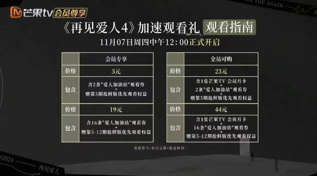 为了接住这一波“泼天富贵”,芒果TV也是煞费苦心,推出了4款定价分别为3元、19元、23元、44元的付费观看礼包。