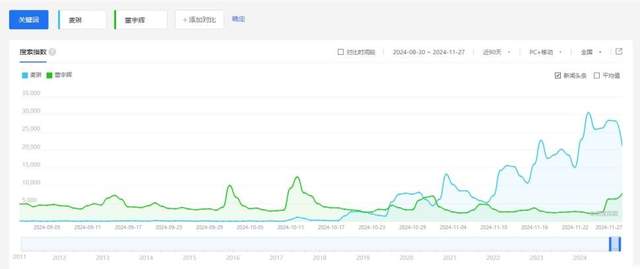 从搜索数据的对比中,我们可以看出麦琳的火爆程度。据百度指数显示,从11月21日《再见爱人4》的第六期播出后至今,麦琳的搜索指数均值都在2万以上,是董宇辉的近10倍。此外,微信指数显示的结果也基本一致,热度之高堪称现象级。