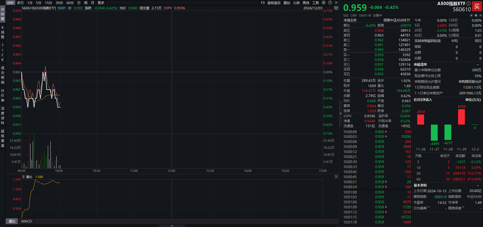 12月3日,A股早盘震荡,A500指数ETF(560610)截至发稿跌0.42%,成交额超2.7亿元,换手率近2%。成分股方面,岩山股份、广汽集团、利欧股份再次涨停,南大光电、许继电气、万泰生物、小商品城等多股跟涨。