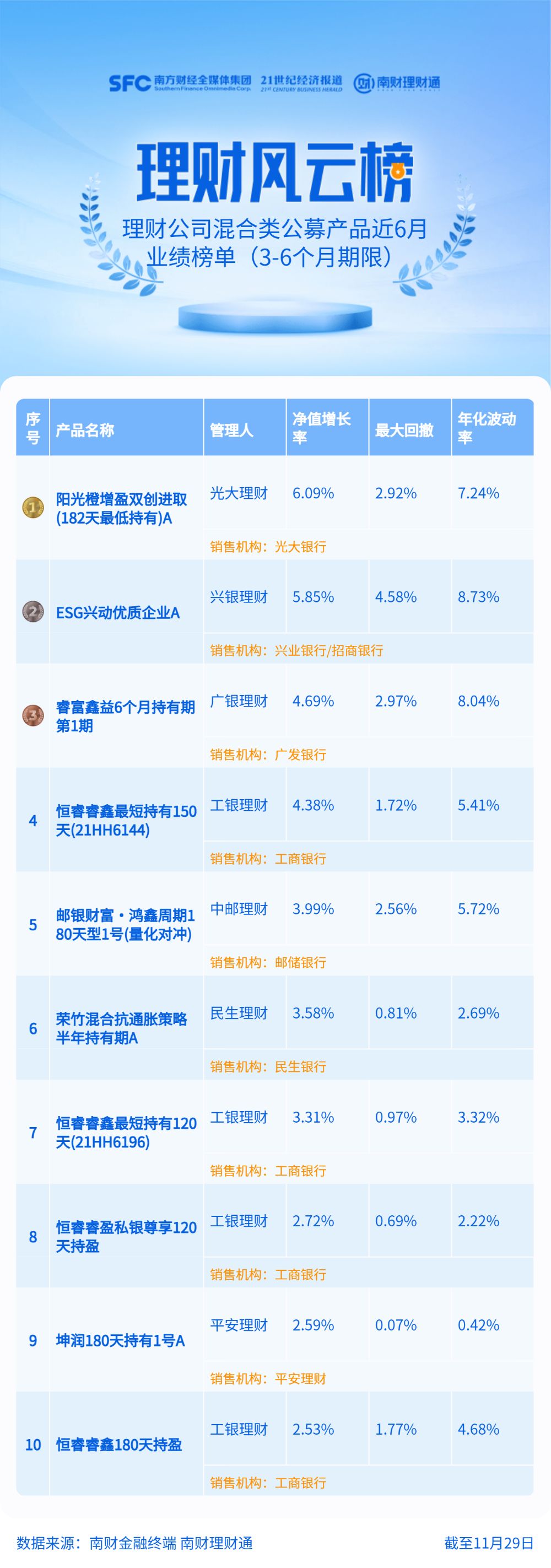 榜单筛选条件:理财公司发行的投资周期在3—6个月(含)的公募混合类产品,同系列同投资周期产品保留一只。