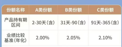 投资者在购买时可以选择到期日,可选持有期范围在2—365天(含),分为三个投资期限区间,分别为2—30天(含)、31—90天(含)和91—365天(含),选择更长期限则对应业绩比较基准更高。该产品设有A、B、C三个份额,业绩比较基准(年化)按份额递增5个基点,分别为2%、2.05%和2.1%。