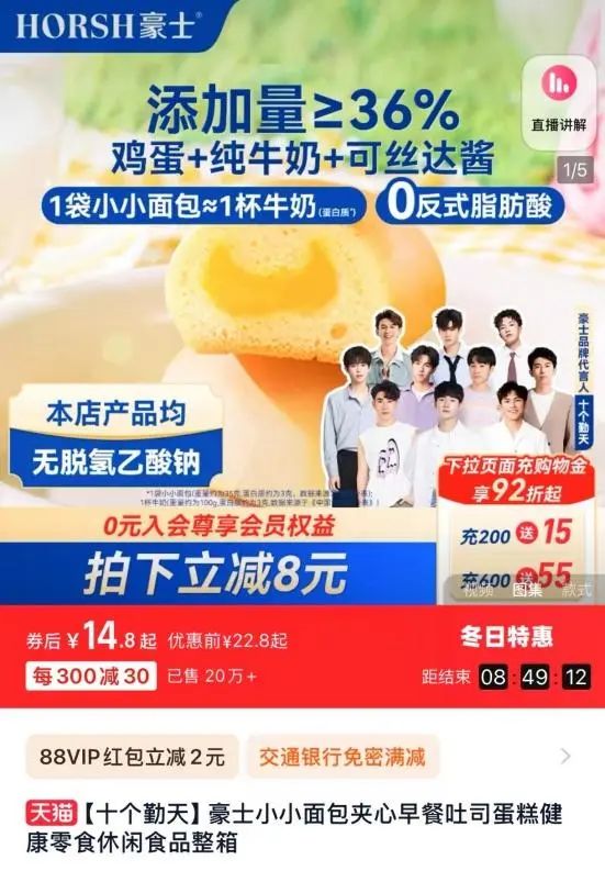 官网显示,豪士前身创立于1995年,目前旗下主打产品有乳酸菌小口袋、小小面包、早餐吐司等中短保面包,其主要通过经销的方式在商超、便利店等网点销售产品。公开信息显示,2018年,豪士年营收超过10亿元;2023年年初,豪士对外透露,其年营收近20亿元。豪士较早就开始发力电视节目营销,而在2023年,其投入超亿元,赞助了《乘风破浪2023年》《种地吧》《狂飙》等热门综艺和电视剧,今年6月,豪士宣布十个勤天为其代言人。