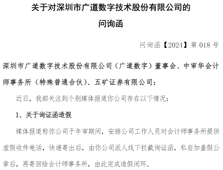 问询函显示,近日有媒体报道,广道数字在年审期间安排公司工作人员对会计师事务所提供虚假收件电话,快递寄出后还派人线下拦截询证函,私自加盖假公章后,再寄回给会计师事务所,由此完成造假闭环。