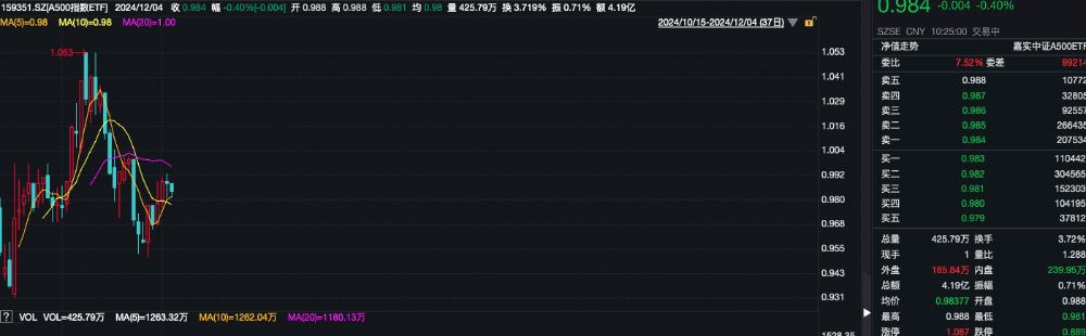相关ETF方面,A500指数ETF(159351)截至发稿跌0.40%,成交额近4.2亿元,换手率超3.7%,早盘交投活跃。