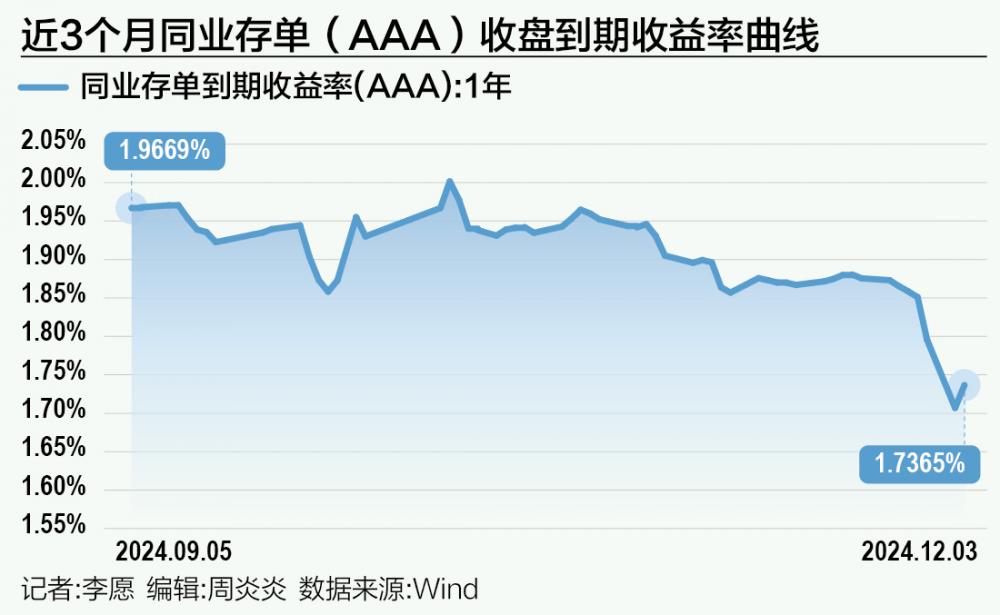 同业存单(AAA)收盘到期收益率曲线显示,12月3日1年期收益率为1.7365%,而11月27日为1.8584%,同比下行0.1219个百分点,10月28日为1.9436%,即11月同业存单利率已经有所下行,且12月这几个交易日降幅相对更大。