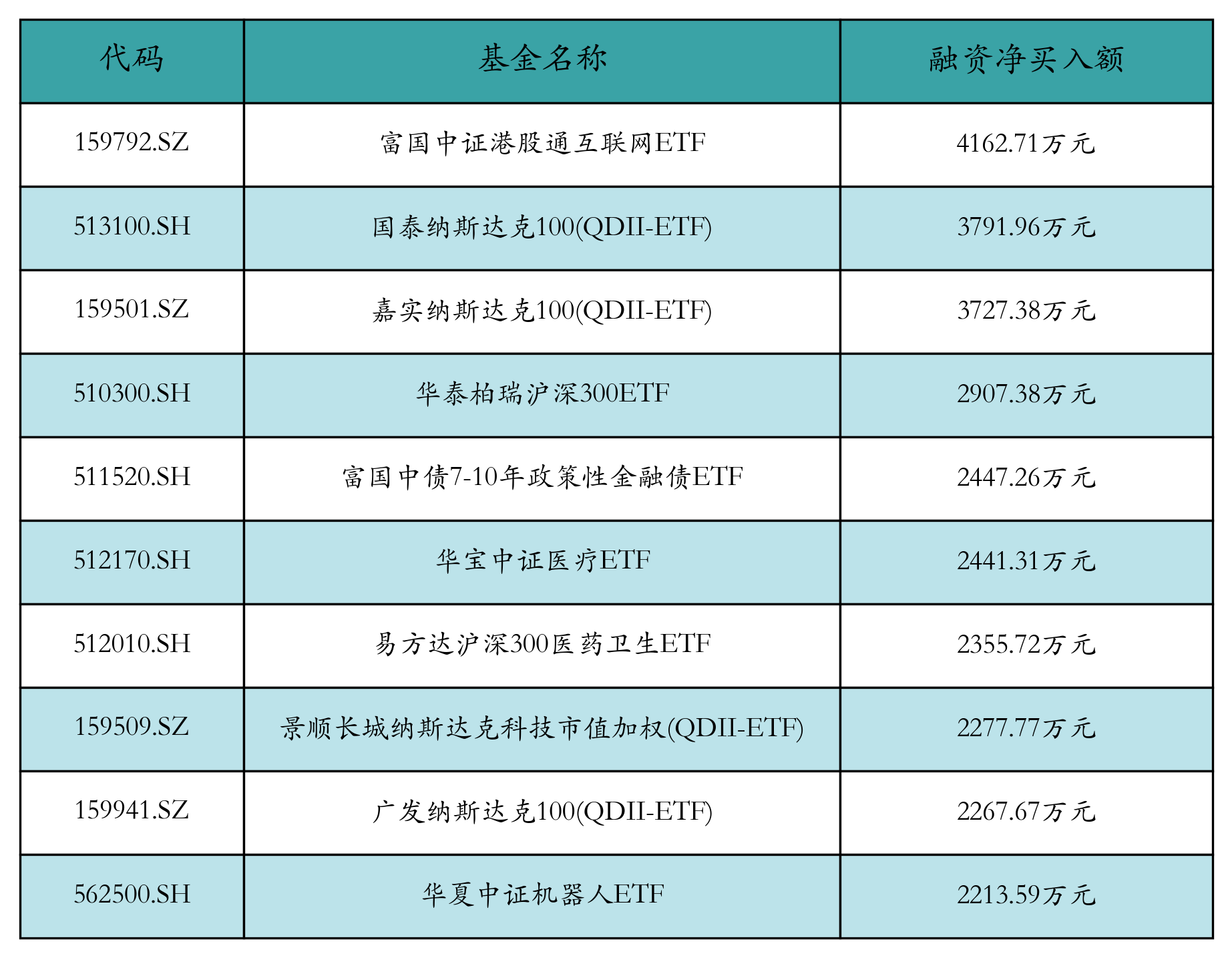 12月4日ETF融资净买入额前三位分别为:富国中证港股通互联网ETF(4162.71万元)、国泰纳斯达克100(QDII-ETF)(3791.96万元)和嘉实纳斯达克100(QDII-ETF)(3727.38万元),前10具体见下表: