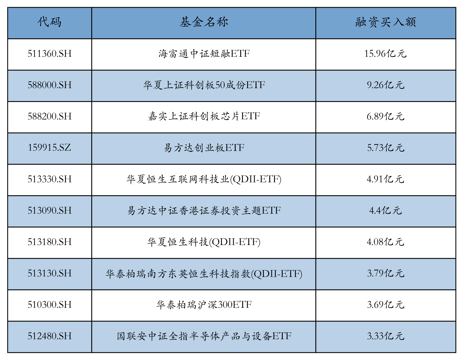 12月4日ETF融资买入额前三位分别为:海富通中证短融ETF(15.96亿元)、华夏上证科创板50成份ETF(9.26亿元)和嘉实上证科创板芯片ETF(6.89亿元),前10具体见下表: