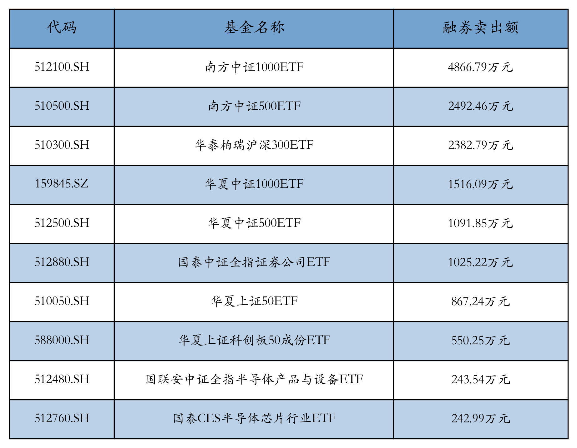 12月4日ETF融券卖出额前三位分别为:南方中证1000ETF(4866.79万元)、南方中证500ETF(2492.46万元)和华泰柏瑞沪深300ETF(2382.79万元),前10具体见下表: