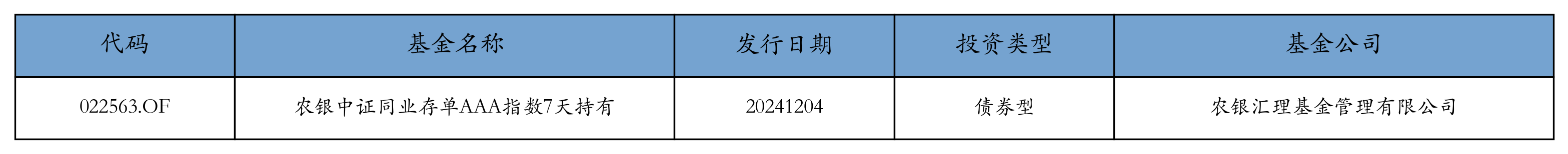 昨日有1只新基金发行,分别为:农银中证同业存单AAA指数7天持有,详情见下表: