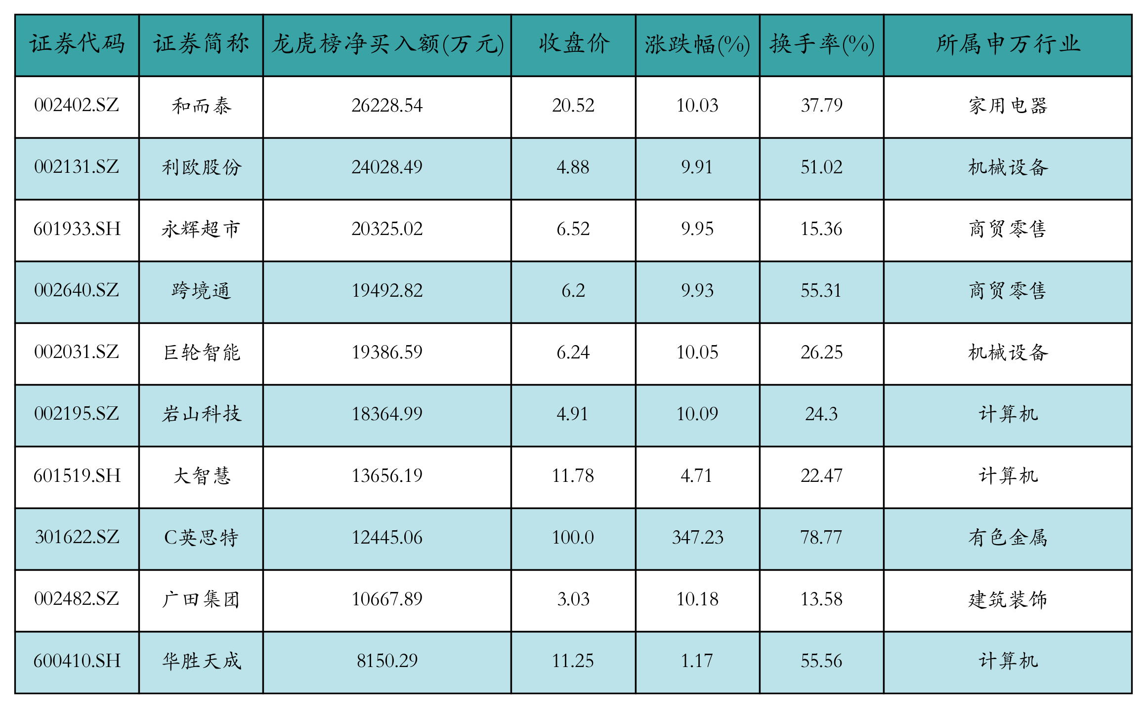 昨日龙虎榜营业部净买入额前10详情见下表: