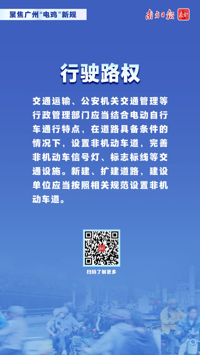 5日下午,广州市人大常委会召开媒体通气会,广州市人大常委会法工委负责人介绍,《规定》对电动自行车生产、销售、维修、登记、通行、停放、充电等管理作了全面规定,对政府相关部门的职责及电动自行车经营者、外卖即时配送等企业的义务和责任作了明确规定,对纠治电动自行车改装、超速、违章、火灾等乱象作了刚性规定。