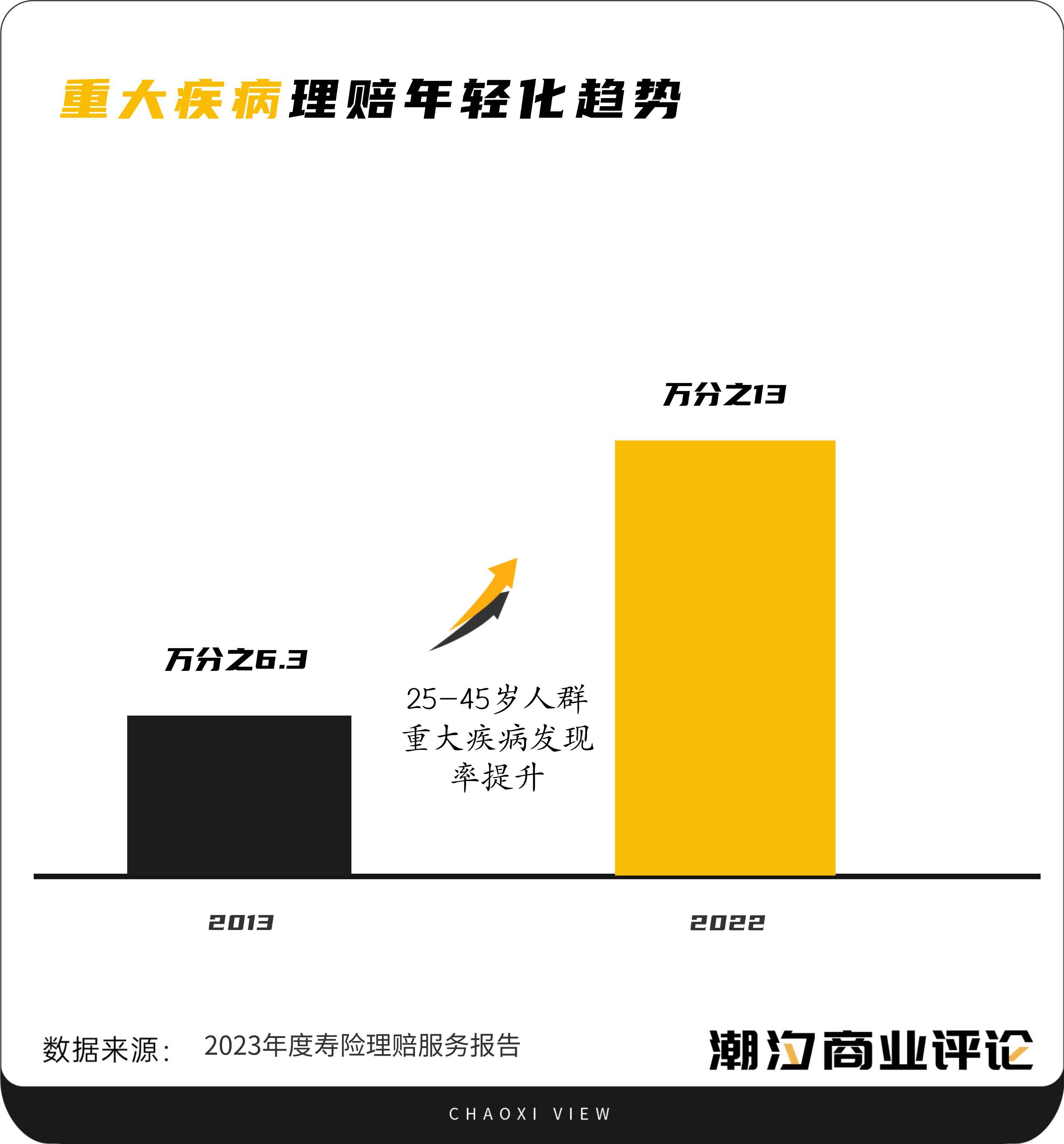 中国人寿发布的2023年度寿险理赔服务报告显示,重大疾病理赔呈现年轻化的趋势,承保的25-45岁人群重大疾病发现率已从2013年的万分之6.3,提升到2022年的万分之12。