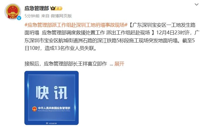 12月4日23时许,广东深圳市宝安区航城街道洲石路的深江铁路5标段施工现场突发地面坍塌。截至5日10时,造成13名作业人员失联。