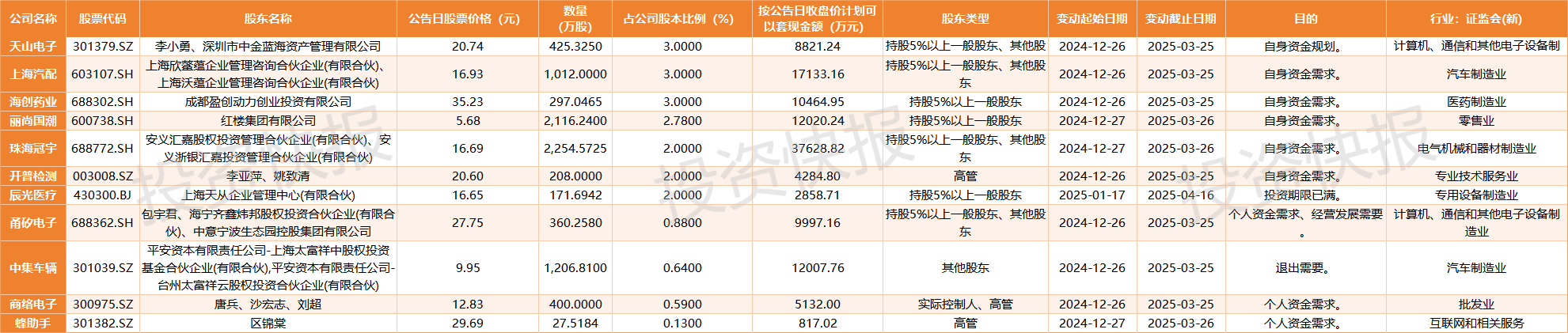 12月6日,据《投资快报》记者统计,昨日共有11家公司发布计划减持公告,涉及的公司包括天山电子(301379.SZ)、上海汽配(603107.SH)、海创药业(688302.SH)、丽尚国潮(600738.SH)、珠海冠宇(688772.SH)、开普检测(003008.SZ)、辰光医疗(430300.BJ)、甬矽电子(688362.SH)、中集车辆(301039.SZ)、商络电子(300975.SZ)以及蜂助手(301382.SZ)在内的多家企业,均发布了减持公告。这些企业的减持主体包括实控人、包括董监高、持股5%以上的股东以及其他股东,减持的原因也各不相同,主要包括个人或企业资金需求等。