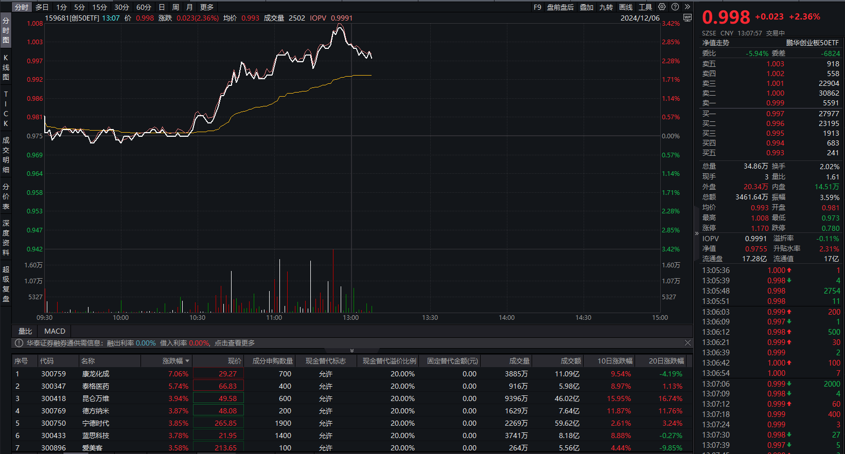 相关ETF方面,截至发稿,创50ETF(159681)涨2.36%,换手率2.02%,成交额3461.64万元。成分股中CRO概念股涨幅居前,康龙化成涨7.06%,泰格医药涨5.74%,昆仑万维、德方纳米、宁德时代、蓝思科技、爱美客均涨超3%。