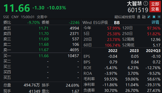 不过,昨日录得5天4板、作为板块龙头股的大智慧(601519.SH),今日却放量大跌10.03%。