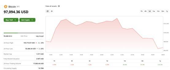 自特朗普当选美国总统以来,比特币价格累计上涨逾40%。周四,受特朗普提名币圈拥趸执掌美国证监会利好刺激,比特币一举突破10万美元大关,最高涨至103713美元。当天晚些时候,比特币开始逆转涨势,从历史高点大幅回落,一度跌至94000美元以下,原因在于投资者获利了结。根据Coindesk的数据,比特币目前交易在97000美元左右。
