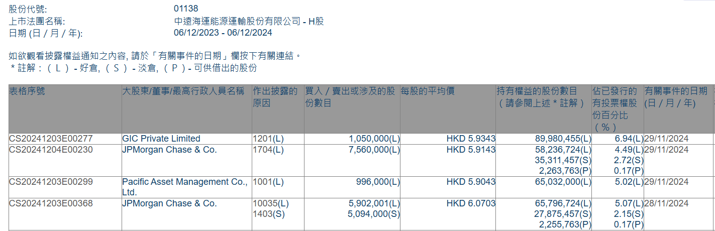 继新华保险12月4日举牌海通证券H股之后,中国太保12月5日举牌中远海能H股。