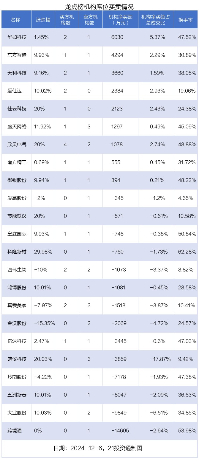 其中,机构净买入金额最多的是华如科技(301302.SZ),当日收盘上涨1.45%,换手率为47.52%。