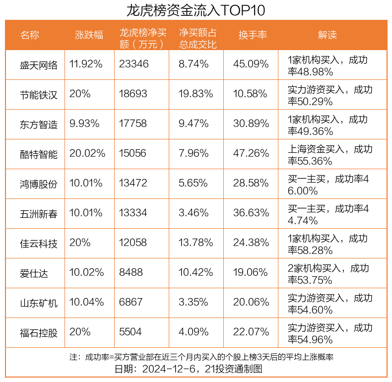 12月6日,上证指数上涨1.05%,深证成指上涨1.47%,创业板指上涨2.05%。盘后龙虎榜数据显示,共有56只个股因当日异动登上龙虎榜,资金净流入最多的是盛天网络(300494.SZ),达2.33亿元。