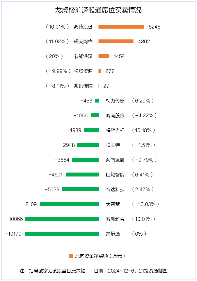 北向资金净买入金额最多的是鸿博股份(002229.SZ),净买入6245.82万元,占总成交金额的2.62%。净卖出金额最多的是跨境通(002640.SZ),为1.02亿元,占总成交金额的1.84%,当日收平,换手率为53.98%。