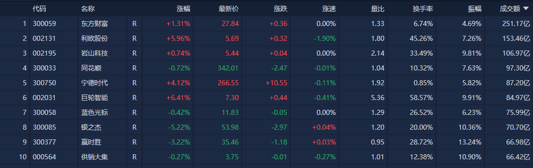 个股方面,东方财富成交额251亿元居首,利欧股份、岩山科技、同花顺成交额在100亿元之上。