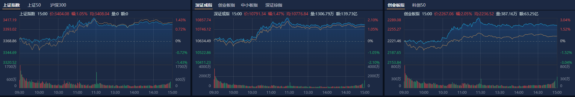 市场早盘震荡拉升,午后高位横盘,创业板指领涨,沪指重回3400点上方。截至收盘,沪指涨1.05%,深成指涨1.47%,创业板指涨2.05%。