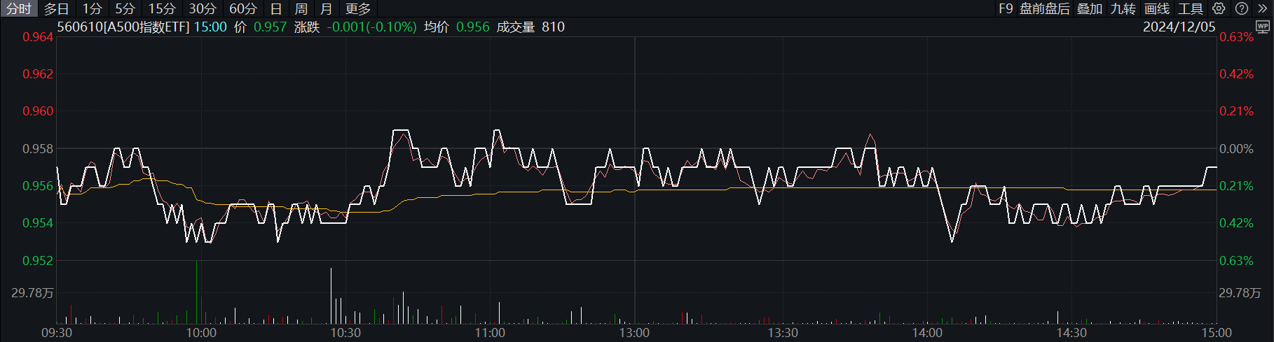 相关ETF方面,A500指数ETF(560610)收跌0.1%,成交额达10.5亿元,连续30个交易日成交额超10亿元,换手率7.36%,全天交投活跃,收盘时溢折率0.09%。