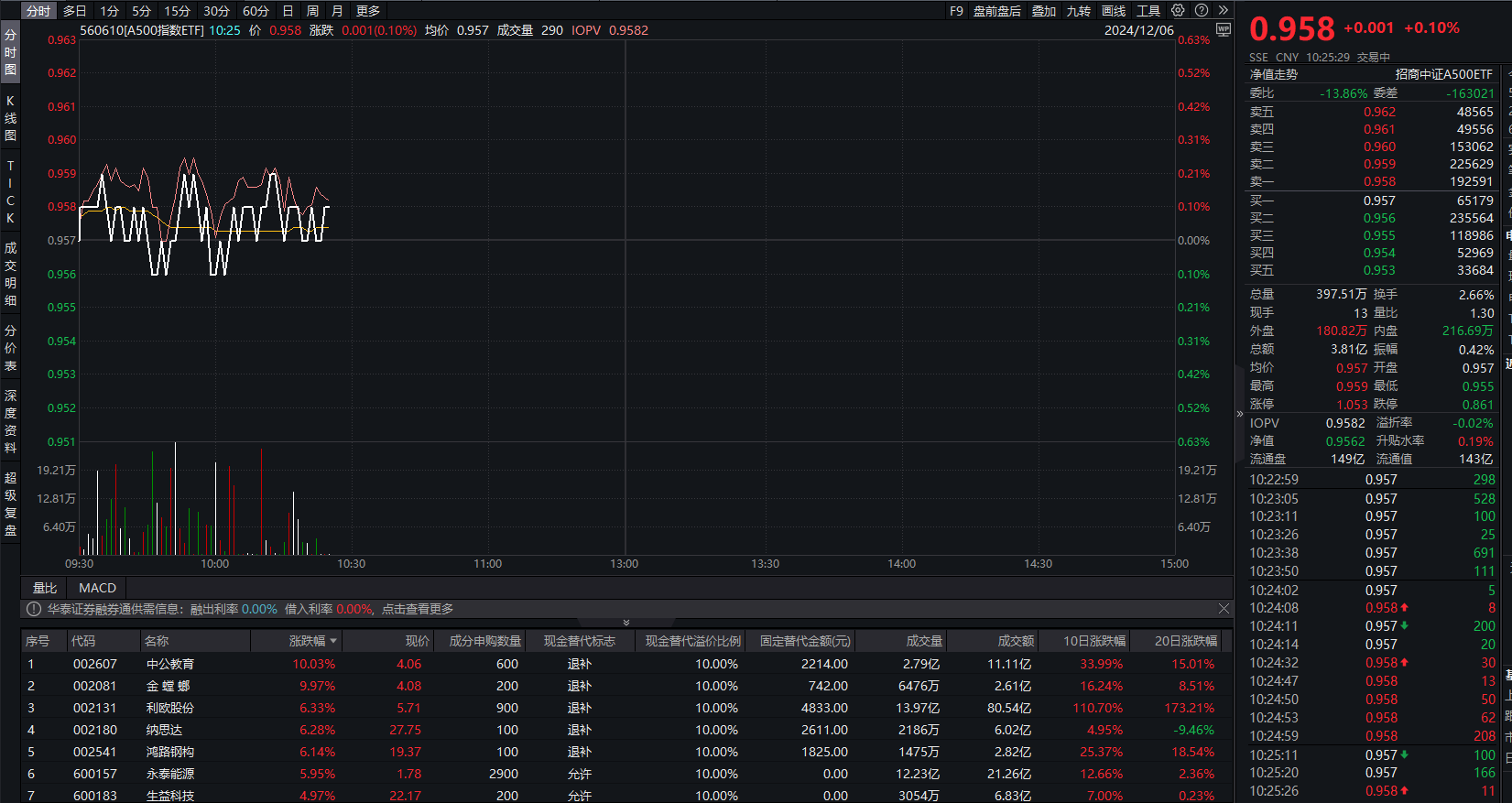 相关ETF方面,截至发稿,A500指数ETF(560610)涨0.1%。成分股方面,中公教育、金螳螂涨停,利欧股份、纳思达、鸿路钢构涨超6%,永泰能源、生益科技等跟涨。