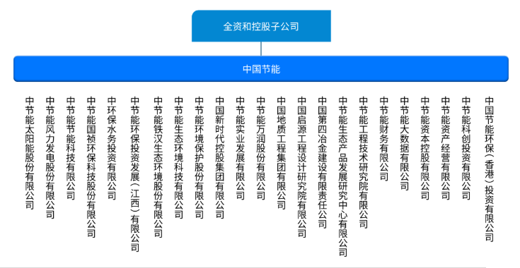 截至目前,中国节能拥有700余家子公司,其中包括6家上市公司,分别为节能环境(300140.SZ)、节能风电(601016.SH)、太阳能(000591.SZ)、万润股份(002643.SZ)、节能铁汉(300197.SZ)、节能国祯(300388.SZ),业务覆盖国内各省、市、自治区及境外110余个国家和地区。