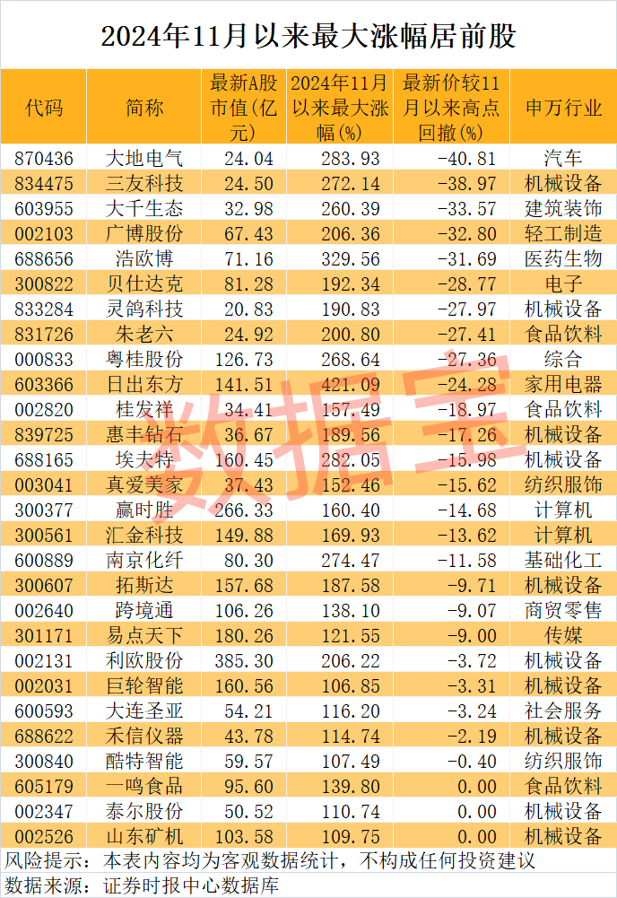 数据宝统计,截至12月6日收盘,11月以来的最高价与10月31日收盘价相比,已有28股最大涨幅翻倍。日出东方最大涨幅421.09%,高居榜首,该股涉及充电桩、网红经济、智能家居、特斯拉概念,11月以来共收获15个涨停板,是同期A股市场收获涨停板最多的股票。在股价大涨前,该股的A股市值不到36亿元,股价不足5元/股。12月2日,该股创历史高点后股价回落,最新收盘价较历史高点回撤24.28%。