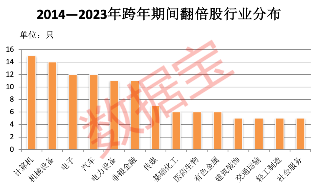 据证券时报·数据宝统计,以每年的11月1日至次年1月31日作为跨年周期计算(下同),2014年—2023年跨年期间,共有151只最大涨幅翻倍(跨年周期内最高价与10月31日收盘价对比)。