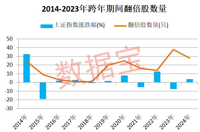 从过往数据看,翻倍股数量的多寡与大盘走势并无太大关联,比如2022年跨年期间,上证指数上涨12.52%,翻倍股数量仅14只;2023年跨年期间,上证指数下跌7.63%,翻倍股数量38只,为过去十年来新高。