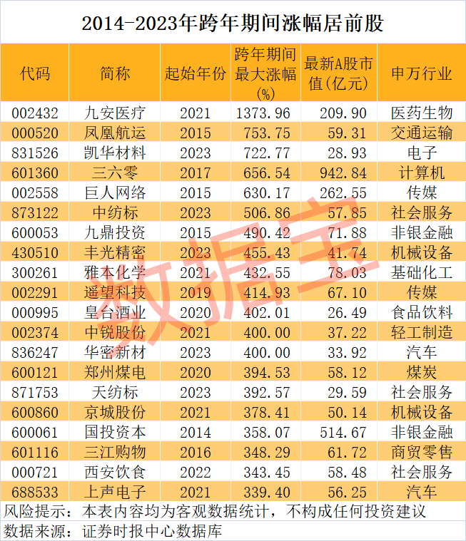 历史数据显示,2014年—2023年跨年期间,最大涨幅翻倍的个股中,6股涨幅超过5倍,分别是九安医疗、凤凰航运、凯华材料、三六零、巨人网络、中纺标,这些牛股炒作均与当时市场热炒的新冠检测、并购重组、先进封装材料、网络游戏、国企改革相关。