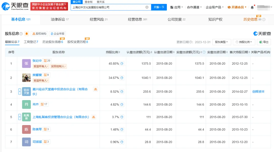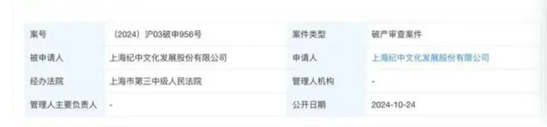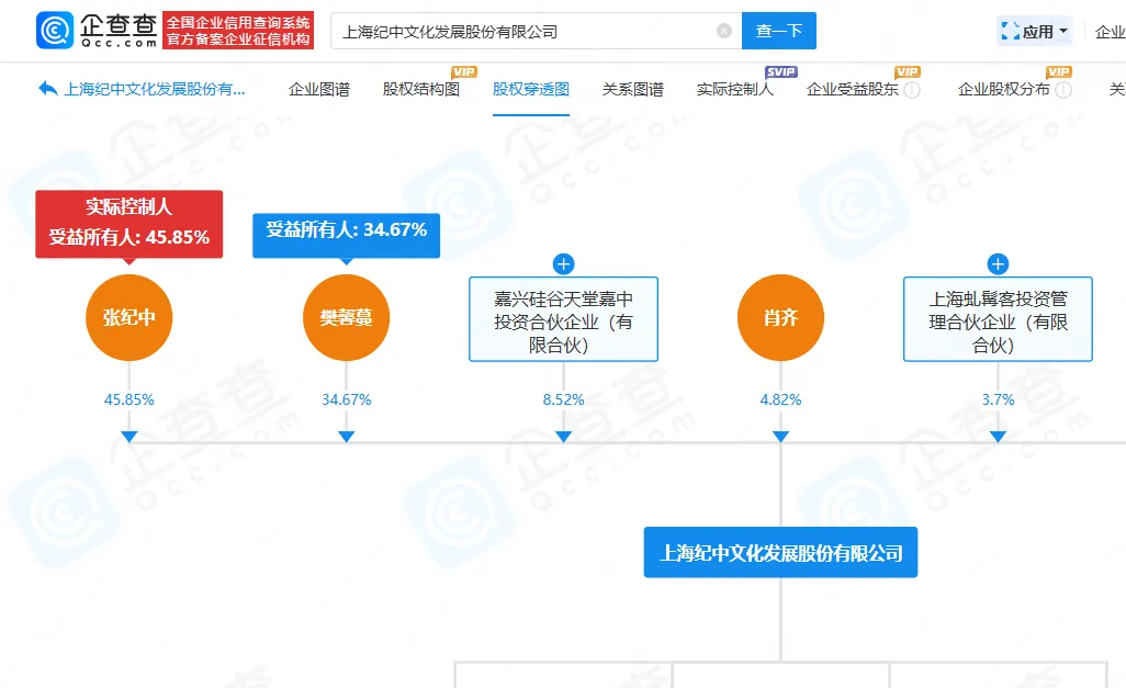 据21世纪经济报道此前消息,企查查信息显示,上海纪中文化发展股份有限公司由张纪中、樊馨蔓、嘉兴硅谷天堂嘉中投资合伙企业(有限合伙)等共同持股,今年10月已申请破产审查。