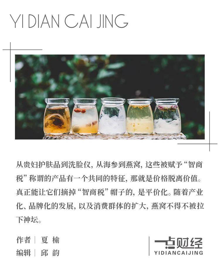 但实际上,从各种贵妇护肤品到洗脸仪,从海参到燕窝,这些被赋予“智商税”称谓的产品有一个共同的特征,那就是价格脱离价值——它们都有一定效用或营养,但价格与之不匹配。在《一点财经》看来,真正能让燕窝摘掉“智商税”帽子的,是平价化。