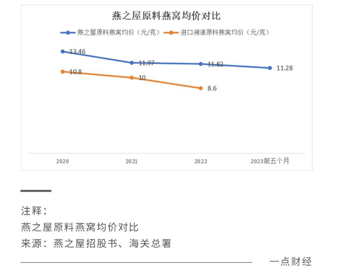 根据招股书披露的数据测算,2020年-2022年以及2023年前五个月,燕之屋原料燕窝的均价分别为13.46元/克、11.97元/克、11.82元/克、11.28元/克。