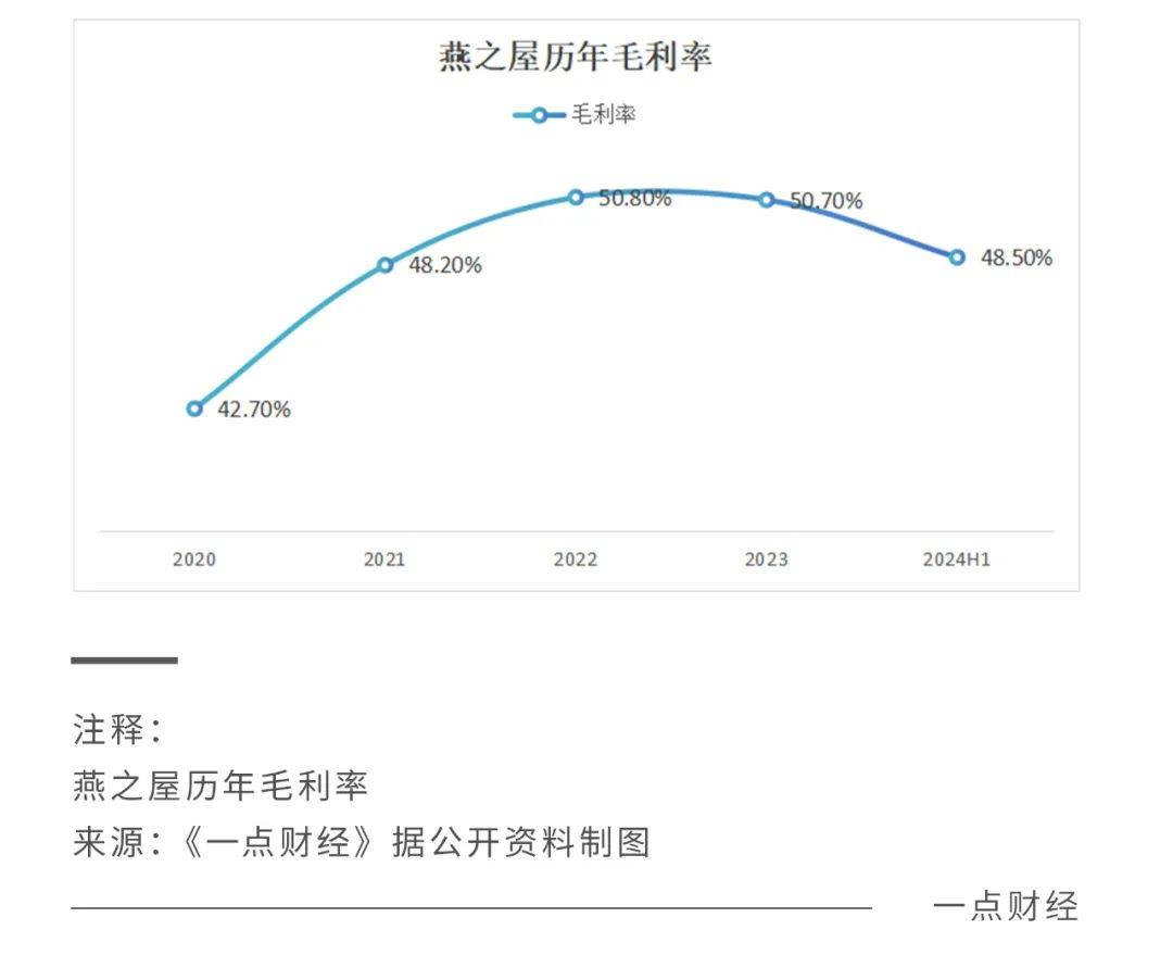 这就是燕之屋毛利率长期保持在50%上下的主要原因。招股书及财报数据显示,2020-2023年及2024年上半年,燕之屋毛利率分别为42.7%、48.2%、50.8%、50.7%、48.50%,其中碗燕的毛利率一直最高,一度在62%上下。