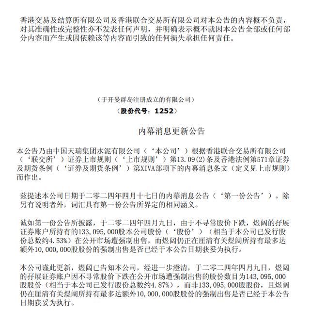 随后中国天瑞水泥宣布短暂停牌,并在4月22日发布公告称,控股股东煜阔表示,4月9日孖展证券账户因不寻常股价下跌,遭强制出售约1.43亿股,另外需要厘清额外1000万股的强制出售是否妥为执行。
