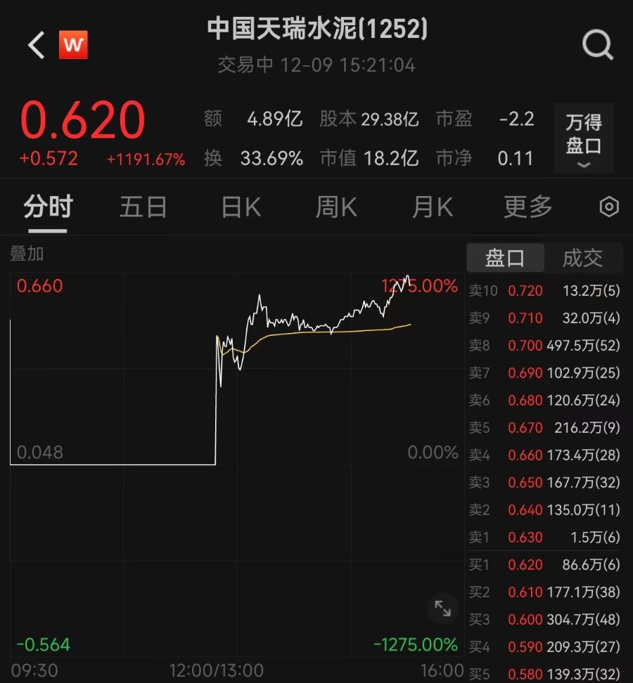 12月9日,时隔7个月,此前大跌的中国天瑞水泥(01252.HK)在午后宣布复牌,盘中涨幅高达10倍。