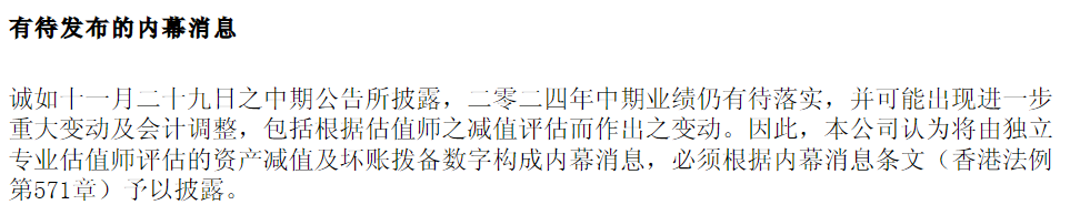 随后,该公司公告,委聘泓亮咨询及评估有限公司展开相关评估工作。泓亮预期于12月18日或之前发出估值报告,公司将尽力于收到估值报告后两日内完成及刊发真实完整的2024年中期业绩。
