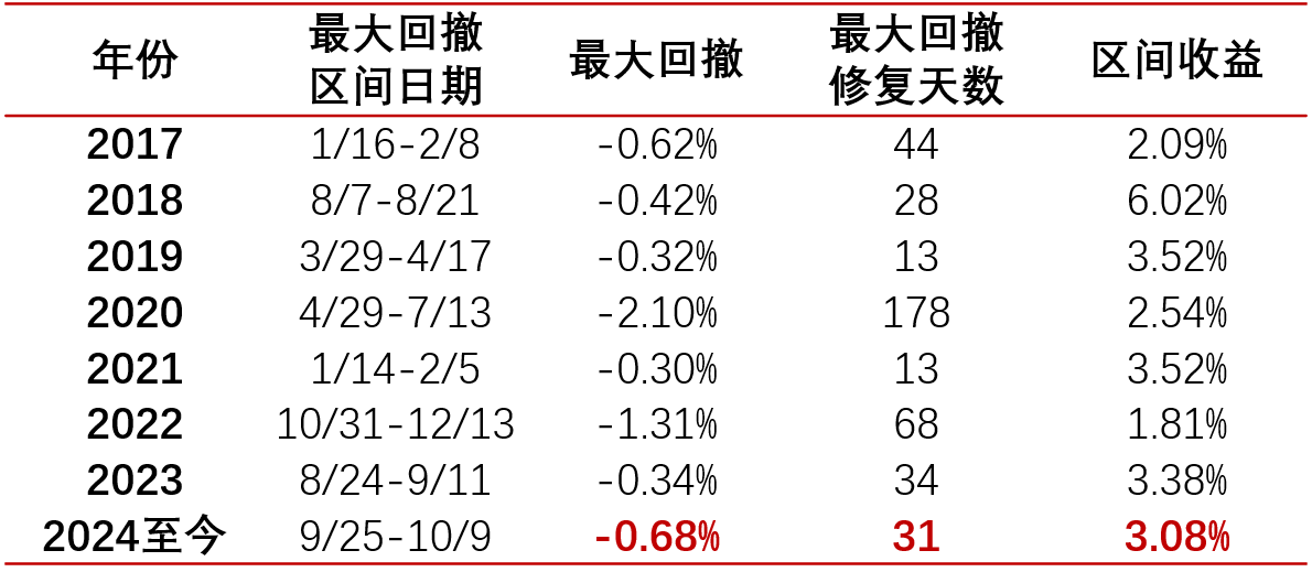以代表纯债基金整体表现的纯债债基指数为例,2024年以来指数最大回撤发生在9/25至10/9期间,区间最大回撤为-0.68%。而此次收复年内最大回撤,只用了31个交易日。