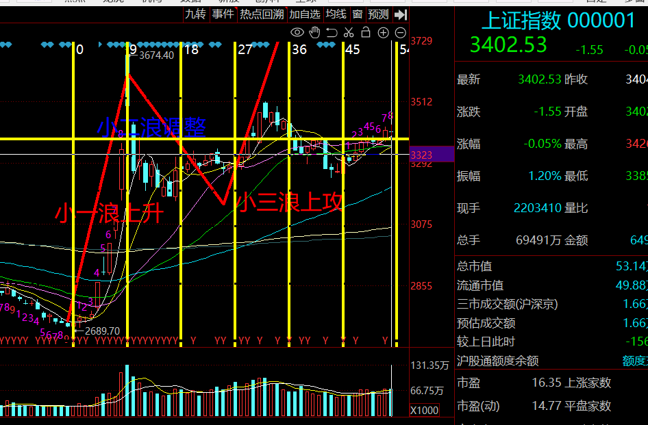 如上图所示,上证的时间周期已经到达9转,而且时间周期是市场的一个转折点,如果上证能够企稳3400点,那么后续成交维持,资金走强,在这个时间周期出现一些拉抬也不是不可能的事情,而反之,如果9转往下调整,也是需要注意部分破位标的的风险,从收盘后,富时A50指数期货走势这么强来看,可能周二是有戏的,不妨积蓄一些仓位,等待进场。