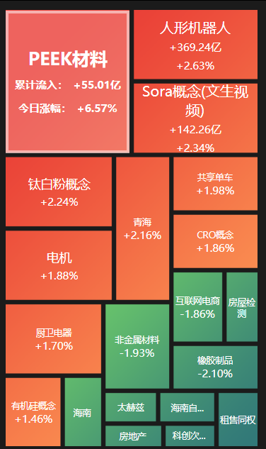 板块题材上,PEEK材料、人形机器人、CRO概念、化工板块涨幅居前;房地产、影视院线、半导体板块跌幅居前。