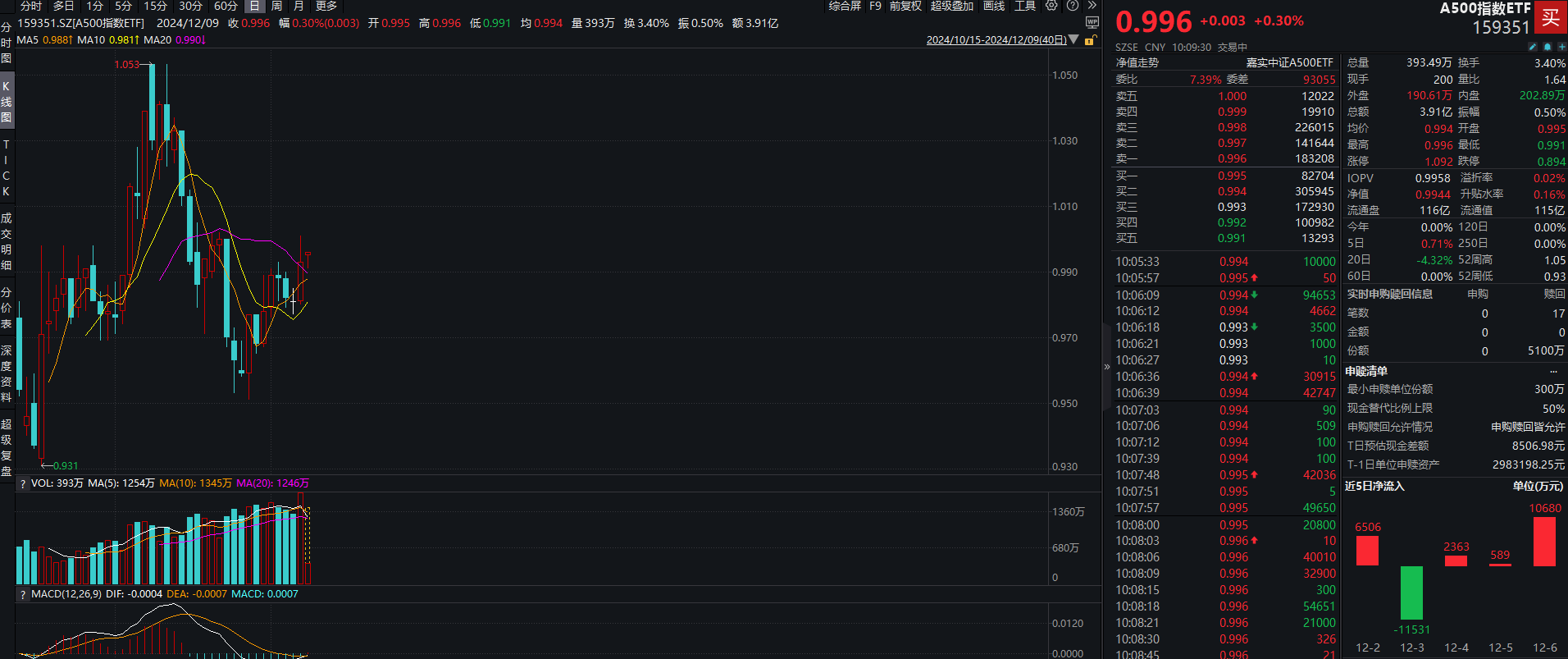 产品规模方面,据Wind 12月6日数据,A500指数ETF(159351)流通规模为115.23亿元、创下历史新高,流通份额为115.88亿份。累计来看,该ETF产品自10月15日上市以来已 “吸金” 超93亿元。