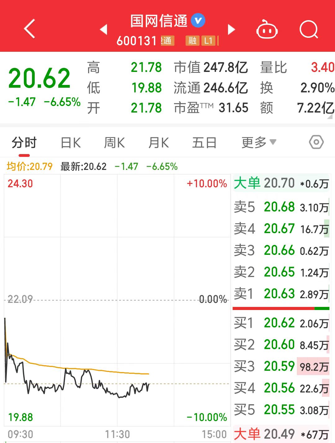 12月9日,国网信通(600131.SH)低开低走,盘中一度触及跌停。截至13时33分,跌6.65%,报20.62元/股,总市值247.8亿元。