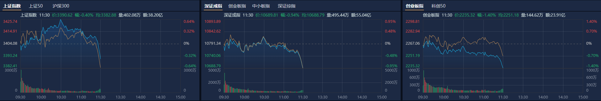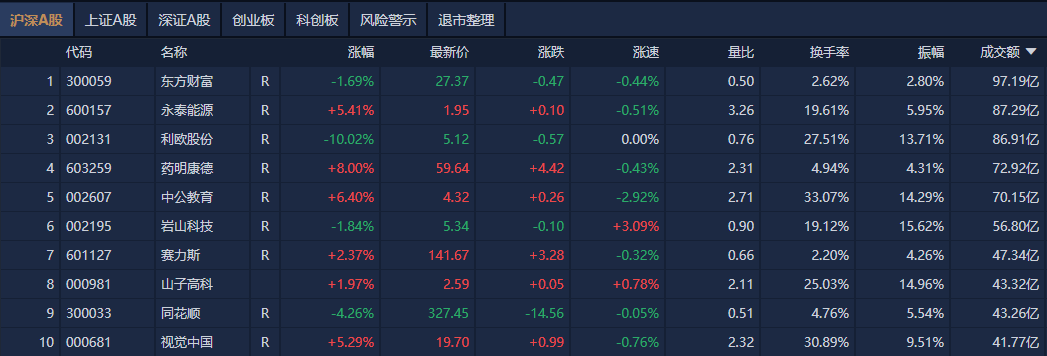 沪深两市半日成交额1.09万亿,较上个交易日缩量594亿。个股方面,南财金融终端显示,东方财富成交额97.19亿元居首,永泰能源、利欧股份、药明康德成交额靠前。