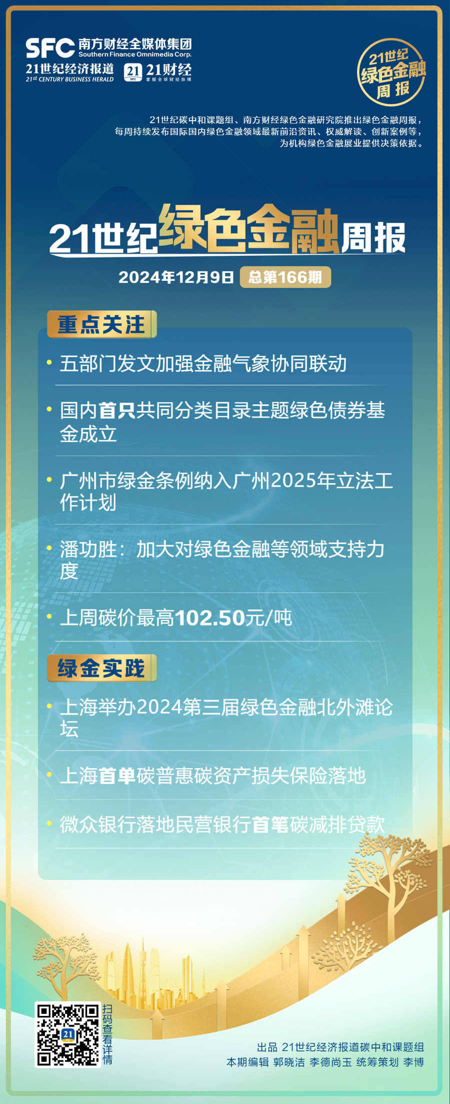 随着绿色金融市场的快速发展,相关的资讯和数据变得越来越丰富。绿色金融周报从宏观视角和机构绿色金融实践等角度,关注绿色金融领域的最新前沿动态,追踪绿色金融市场的最新趋势,为绿色金融相关参与方提供决策依据和参考。