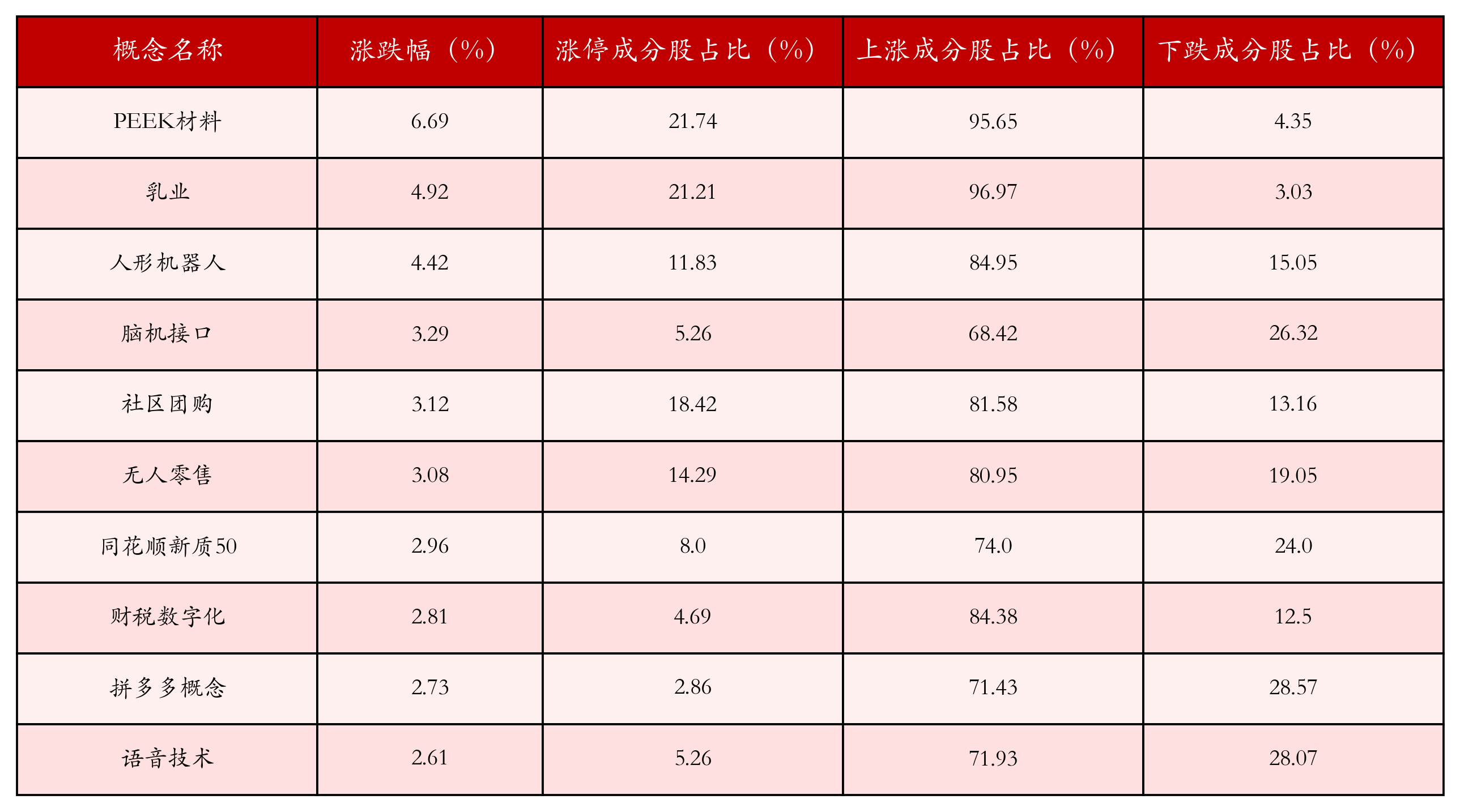 根据同花顺A股概念涨跌幅与所对应的股票池综合分析,涨幅靠前的三个概念板块分别为:PEEK材料、乳业与人形机器人。排名前10位的概念板块相关数据见下表:
