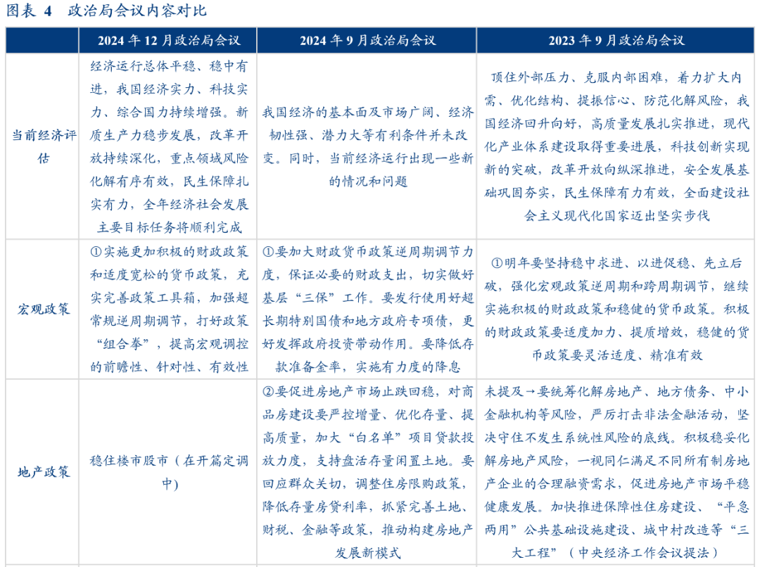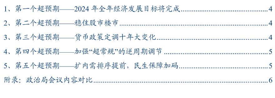综上,在简短的政治局通稿中,超预期或首提的表述多达五点。我们认为继2024年9月26日政治局的“政策底”之后,政策开始进入了加速加码期,政策方向明确、表态坚决、力度加大(适度宽松、超常规)、抓住牛鼻子(股市、楼市)。具体政策细节在接下来即将召开的中央经济工作会议会有更多部署,市场风险偏好有望继续修复。